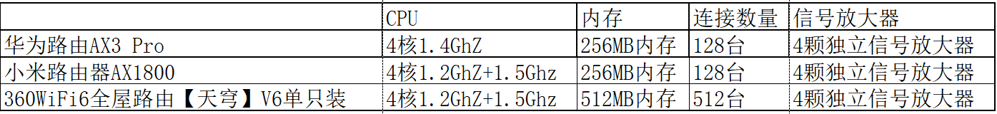 这三款路由器价格相同,不过就配置而言,360WiFi6全屋路由 天穹 V6略微给的多。内存512MB是另外两个产品的2倍,连接数量能力大,实际使用肯定是内存大来的实在。