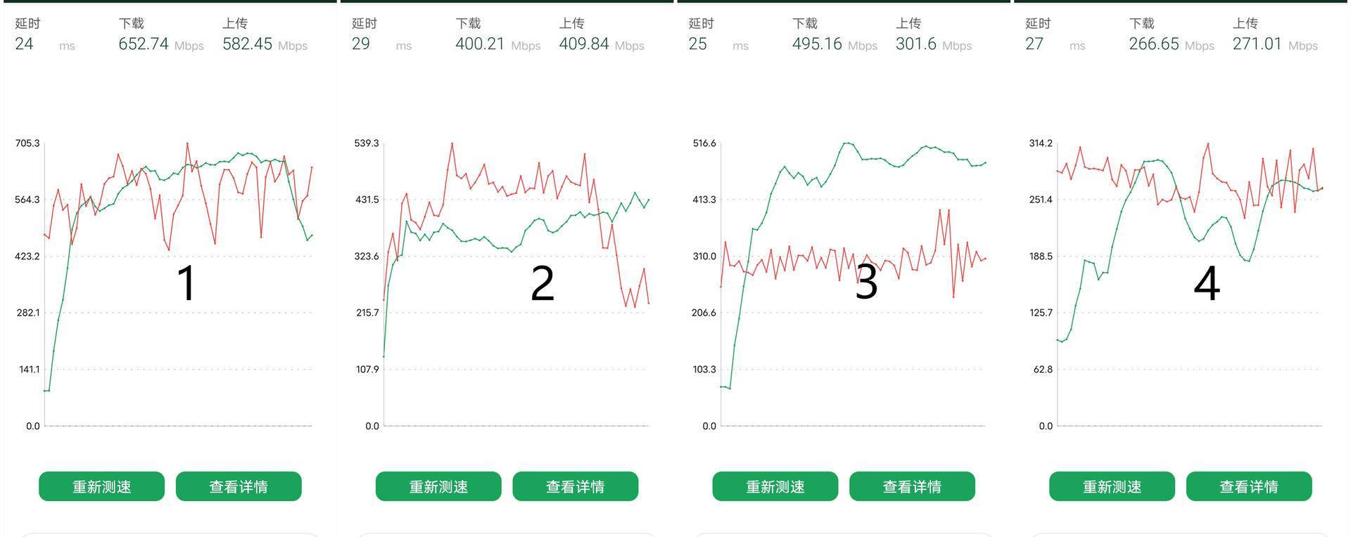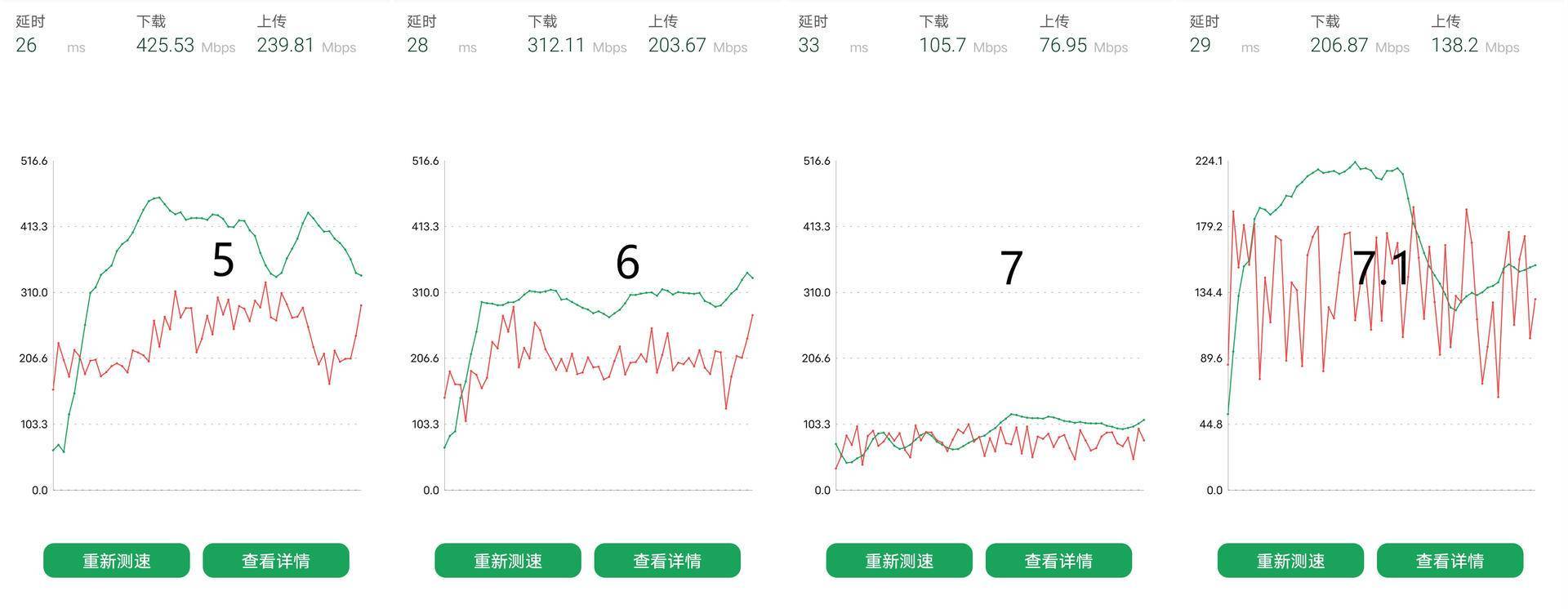 测试结果没有什么意外,距离越近网速越好。在最远的位置4,7都存在隔多层墙的情况,不过对于网速哪怕最差的位置7,依旧还有100Mpbs的网速,折合12.5MB/s,这对于手机、电脑上网也是完全够用的,延时30ms对游戏的影响也可以忽略不计。