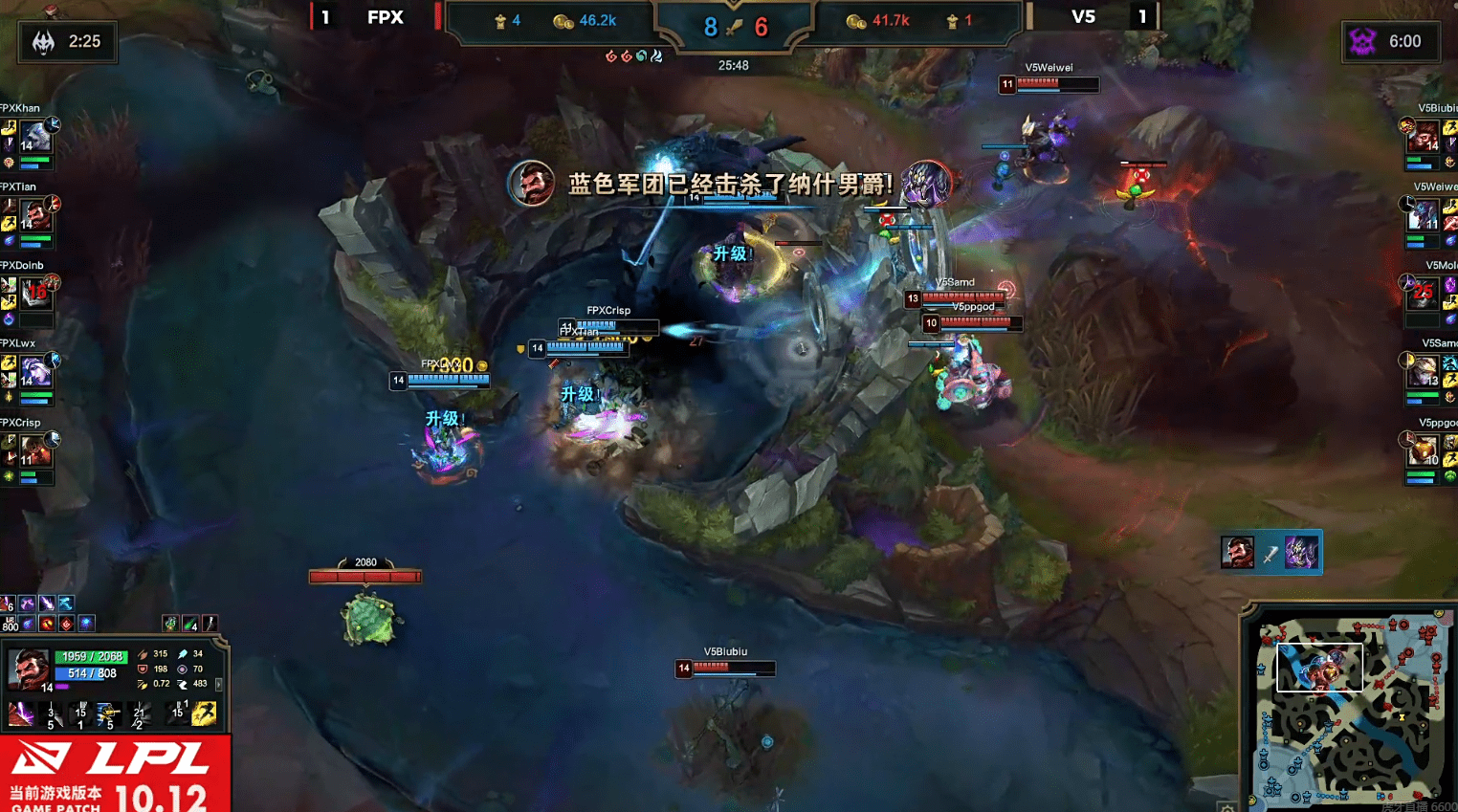 在下路遭重后V5中野选择游走上路,包夹压线过深的汉子哥狗熊成功击杀,挽回一个人头,不过随后下路samdEZ又是遭到了FPX的军训,下路已经有些崩线,ppgod巴德选择了游走,大招直接定住中路防御塔,开门闪现Q留住doinb兰博,配合中野完成了击杀,但FPX支援也非常迅速,小天男枪和汉子哥狗熊包夹也击杀了巴德!
