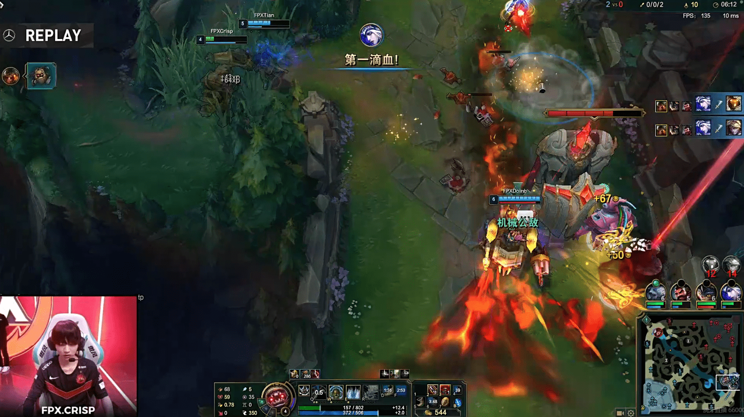 在开局对线期FPX三条线都是处于推线状态,取得线权的情况下,doinb兰博到达6级,配合小天男枪来到下路,刘青松泰坦越塔先手提供控制,Q墙拉开距离,FPX经典四包二战术,Lwx寒冰一个万箭齐发成功收获一血,一波双杀直接起飞!