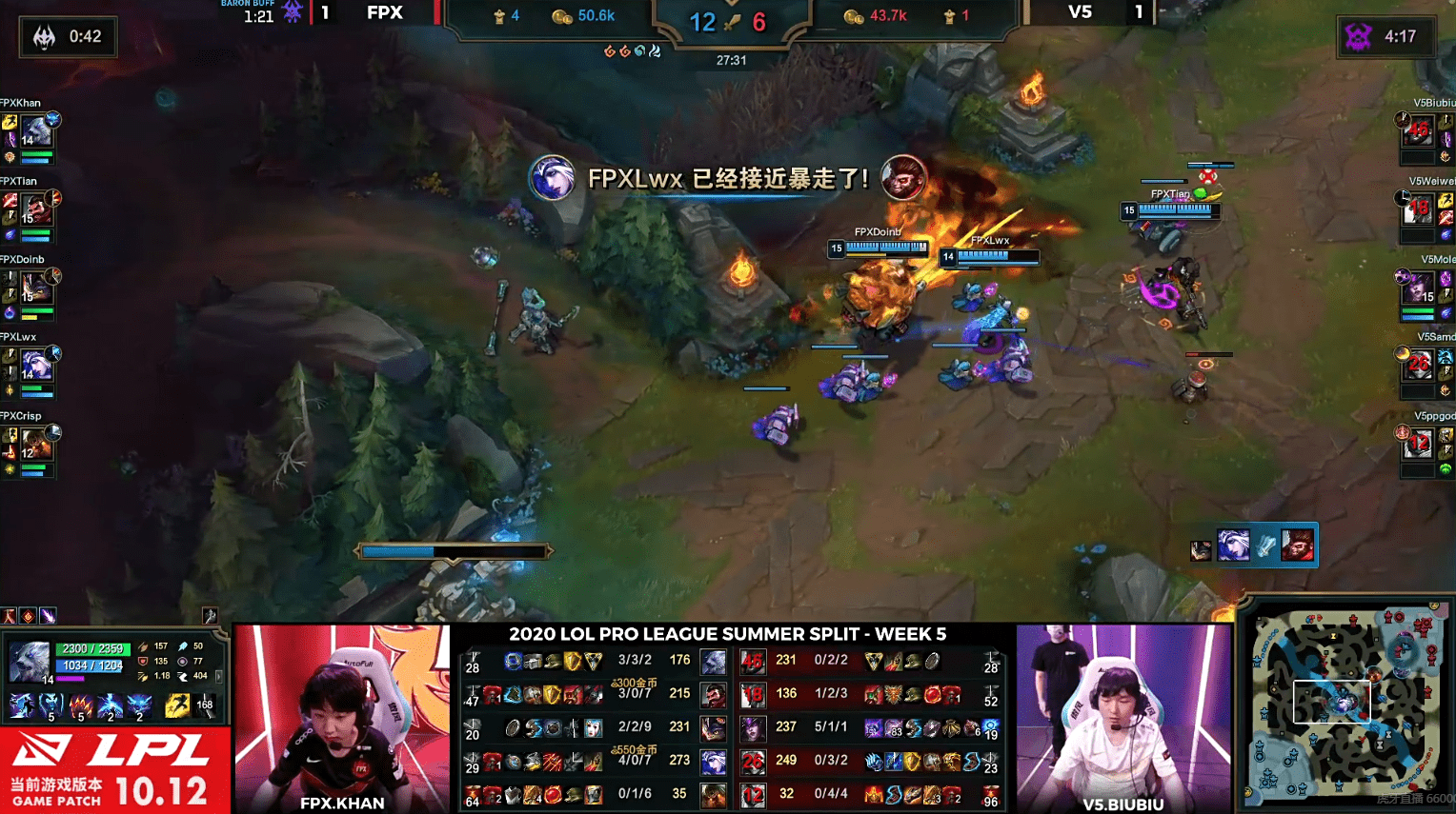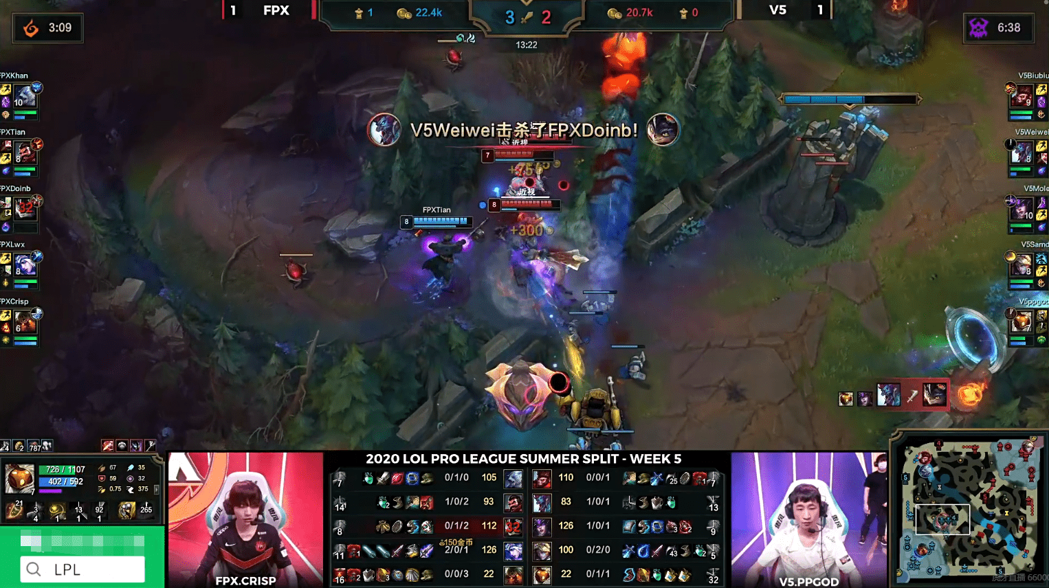 27分钟时FPX逮到了V5做视野的野辅,虽然ppgod巴德及时开门,但是被Lwx寒冰一箭命中,doinb兰博远程跟大,伤害灌死了V5野辅,samdEZ也被刘青松泰坦一钩留下,阵亡3人后,biubiu猴子想要切落单的Lwx寒冰,不过寒冰装备太好了,三件套双吸血加治疗站撸猴子完成击杀!