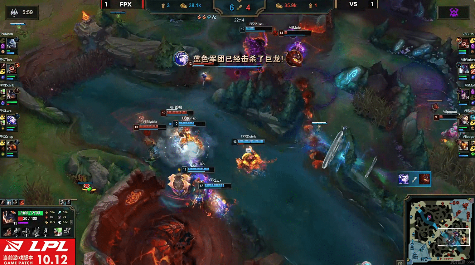 在劣势的情况下V5想找机会,3人蹲伏抓单带的doinb兰博,但doinb有所察觉,位置靠上走,虽然V5成功开到并且击杀了兰博,但也被赶来的刘青松泰坦加上Lwx寒冰远程大招留住了小东北辛德拉,双方中单互换,FPX4人齐聚上路,抓住V5上野状态不好的时机,直接rush掉了大龙!