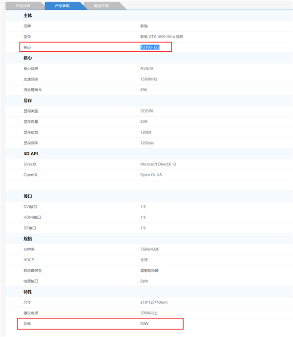 影驰规格表里误写作GTX 1660 Ultra、6GB显存