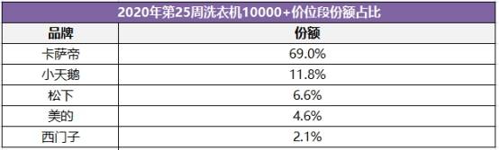 据中怡康6月29日发布的第25周最新数据显示:万元以上洗衣机品牌中,卡萨帝以69%的份额排在首位;小天鹅份额为11.8%,松下份额为6.6%,美的、西门子分别为4.6%和2.1%。