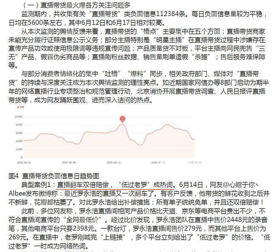 29日,中消协网站发布《“618”消费维权舆情分析报告》,报告中称“直播带货最火爆各方关注问题多”,“典型案例1:直播翻车双倍赔偿,“低过老罗”成热词。