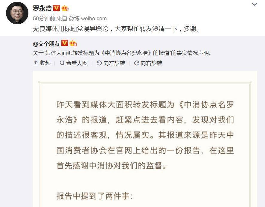10时左右,罗永浩助理官方微博“交个朋友”发布了一份关于“媒体大面积转发标题为《中消协点名罗永浩》的报道”的事实情况声明。