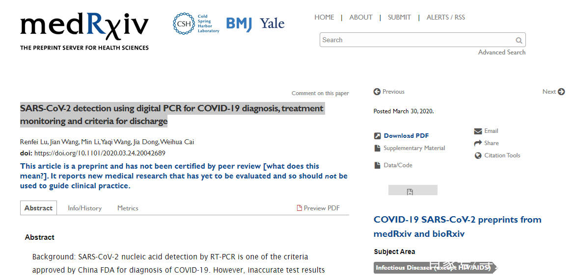 2020年5月22日,武汉大学病毒学国家重点实验室蓝柯和陈宇团队在Emerging Microbes & Infections杂志上发表了一篇研究论文。该研究使用数字PCR检测方法检测了多处环境中的样本,在病人用的厕所、医护人员更换防护服的房间内、重症病人ICU 室内的都检测到了新冠病毒,充分表明了数字PCR高灵敏度在环境检测中的潜在应用。研究发现,相较于核酸检测行业中普遍使用的金标准技术RT-PCR,ddPCR对低载量SARS-CoV-2病毒的临床检测优势更突出,可以减少假阴性结果。这个发现将会是对现行核酸检测标准的强力补充。