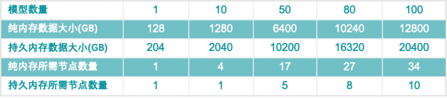 AI为企业带来出众的业务效果,同时企业也要承担AI产生的成本压力,特别是当AI规模化应用时。以某著名手机终端厂商为例,分别采用配备384GB 纯内存服务器和配备2TB持久内存的服务器为预估单节点基准。每上线一个模型在在纯内存的参数服务器上占用内存空间大概是128GB。基于持久内存的数据结构由于其有额外的持久化逻辑,在空间复杂度上会略高于纯内存数据结构,其空间占用大概是204GB。在此基础上,估算企业上线1-100个模型参数服务器所需的纯内存物理节点数和配备持久内存的物理节点数量。