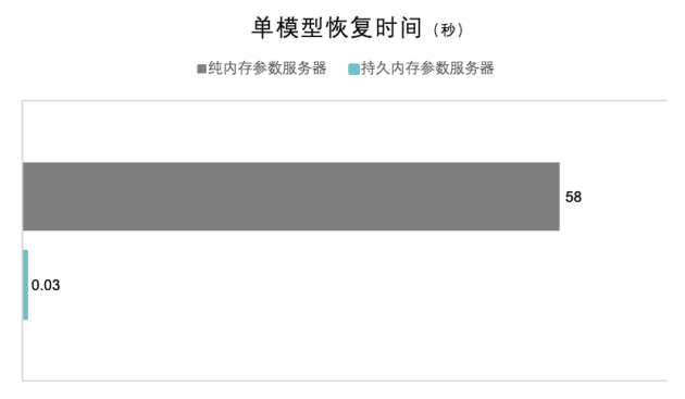 以恢复6千万维参数模型为例,纯内存参数服务器恢复模型需要花费58秒,而持久性内存参数服务器只需要0.03秒,故障恢复时长缩短将近2000倍。