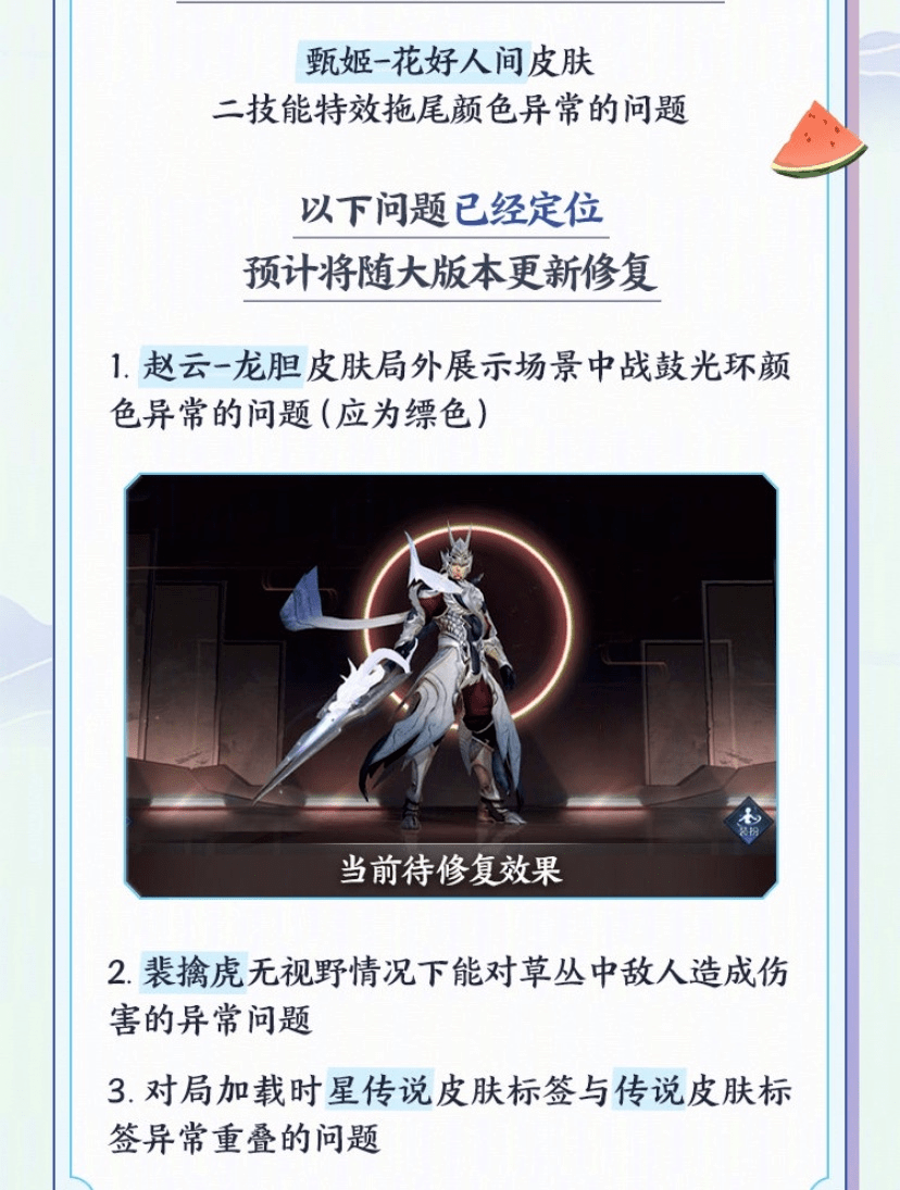 在昨天新鲜出炉的亚瑟答疑时间中,官方针对赵云—龙胆局外战鼓光环颜色异常等问题正在进行修复之中,并且甄姬—花好人间皮肤异常等问题也被修复。