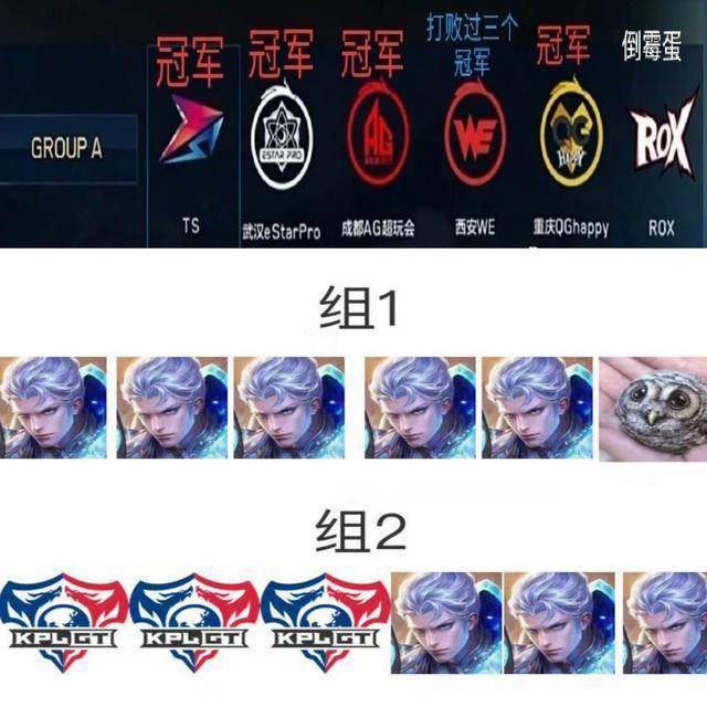 看上图,TS战队和武汉es、成都AG超玩会、西安we、重庆Qghaapy、Rox六支战队为A组。B组是gog、DYG、emc、mtg、广州TTG.XO。这个结果只有DYG笑了,要知道A组直接被网友称为死亡之组,看看这阵容,四个冠军战队,一个打败过三个冠军的战队,还有一个倒霉蛋。最可怜的便是境外的Rox战队,简直就是本世冠杯的炮灰