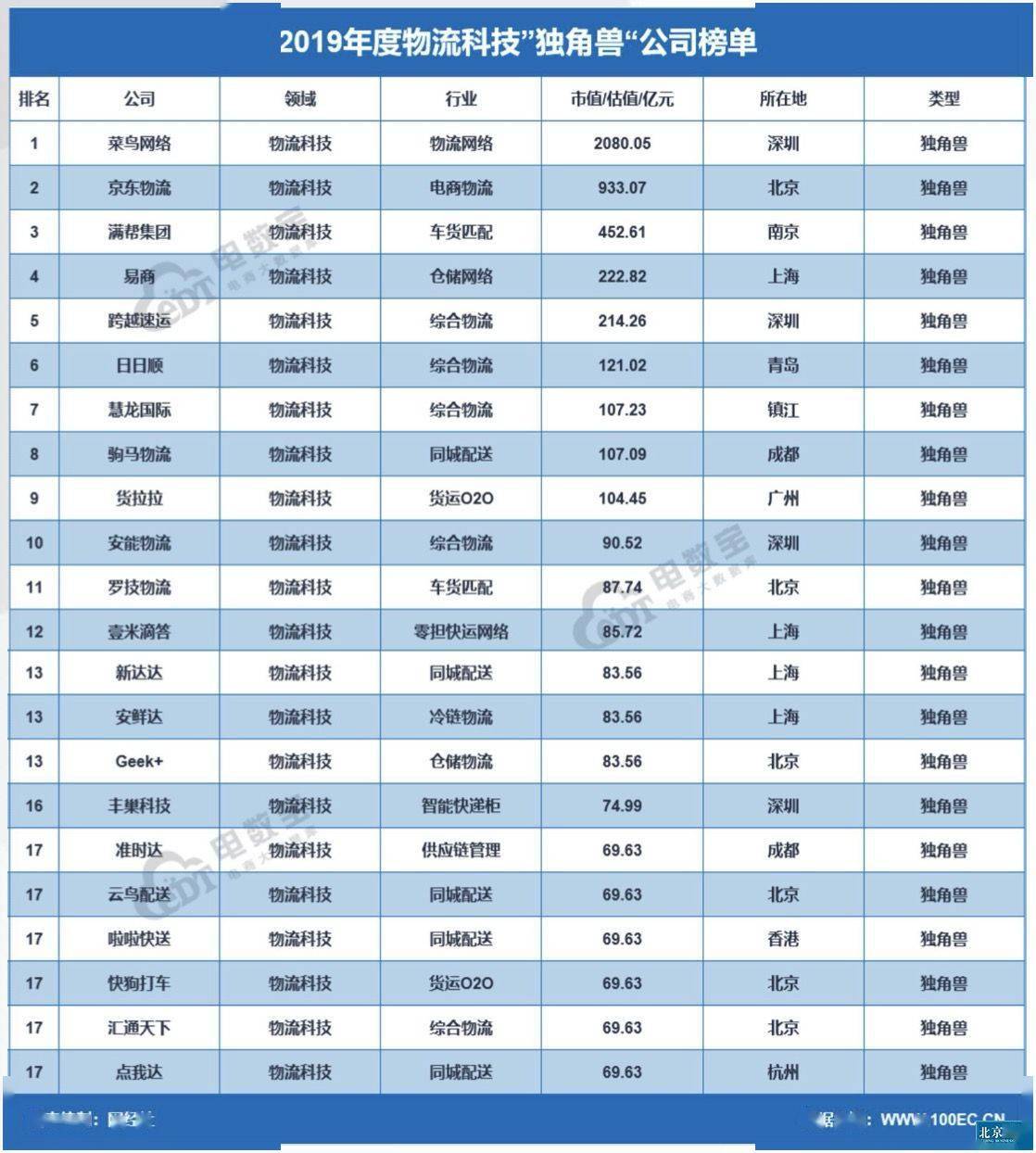 总体而言,《报告》显示,2019年,物流科技共有22家“独角兽”,同比增长37.5%。总估值达768.33亿美元,同比增长3.1%。菜鸟网络(298.72亿美元)、京东物流(134亿美元)、满帮集团(65亿美元)领衔前三位。