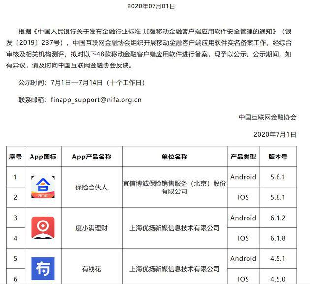 7月1日早上消息,中国互联网金融协会公示移动金融客户端应用软件拟备案名单,共48款软件,度小满理财、中原消费金融、融360等在列。