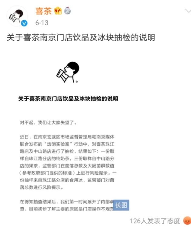 就此,6月13日喜茶在其官方微博发布了关于喜茶南京门店饮品及冰块抽检的说明,称公司目前初步了解主要原因是门店操作不规范所致,如取冰时把使用过的冰铲直接放置在冰块上,制作饮品时冷藏牛奶放置在常温状态中时间太久等,并发布了5项整改措施。