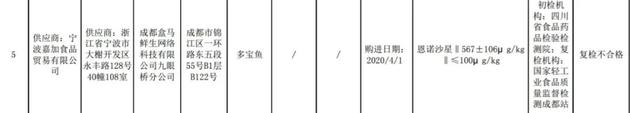 6月29日,四川省市场监督管理局关于15批次食品不合格情况通告称,成都盒马鲜生网络科技有限公司九眼桥分公司销售的、来自宁波嘉加食品贸易有限公司的“多宝鱼”,被检出禁限用兽药超标。该抽查信息显示,盒马出售的多宝鱼所含抗菌药恩诺沙星不符合食品安全国家标准规定。