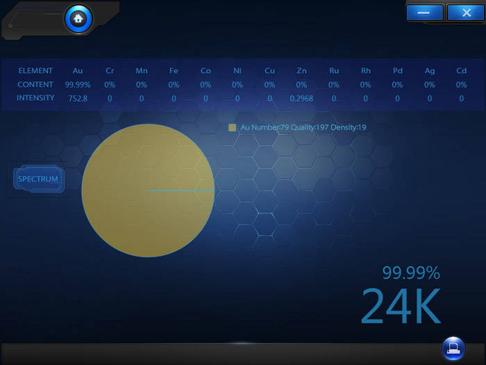软件:菜单式软件,带硬件参数调整和数据评估及计算;软件除能显示金属百分比纯度外,亦可显示黄金K值;软件可自动重复检测,自动测算多次检测的均值