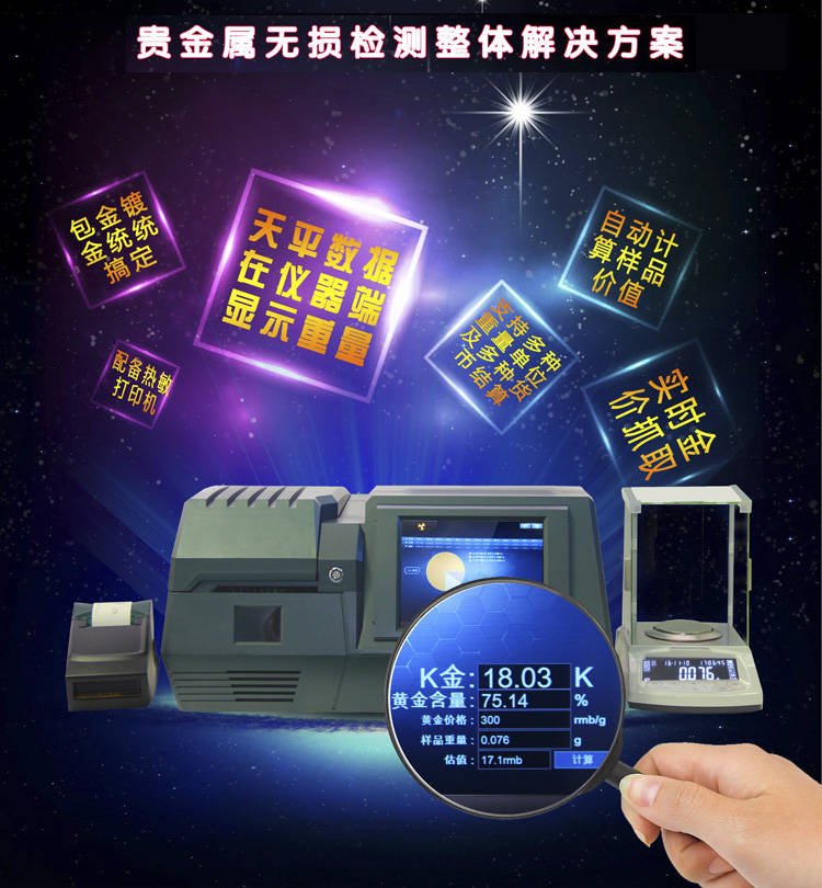 1.配备水比重仪器, 同时数据结果自动分析是否镀金或包金.