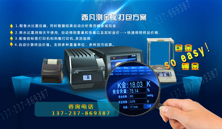 1.配备水比重仪器, 同时数据结果自动分析是否镀金或包金.2.将水比重用做天平使用, 自动得到重量和含量以及实时金价-->快速得到样品价格.3,配备的标签打印机和热敏打印机,灵活选择.