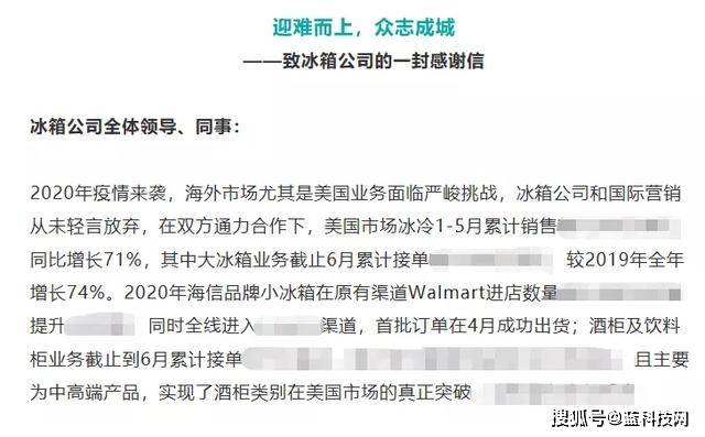 信中写道:2020年疫情来袭,海外市场尤其是美国业务面临严峻挑战,海信冰箱公司和国际营销通力合作,美国市场冰冷产品1-5月累计销售额同比增长71%,其中大冰箱业务截止6月累计接单额较2019年全年增长74%。