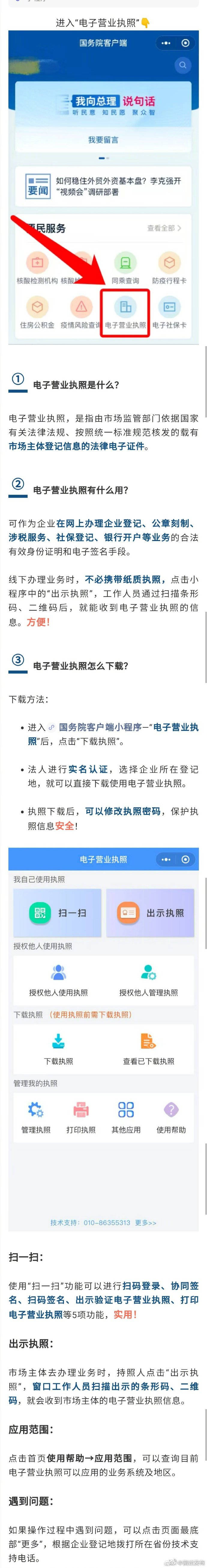 【手机可以下载电子营业执照了!】此处@广大市场主体,营业执照可以在手机上下载使用啦!由国家市场监管总局推出的“电子营业执照”在国务院客户端小程序上线,具体步骤如下:
