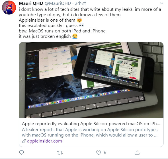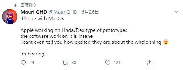 爆料来源是推特的 MauriQHD,这位科技爱好者来自阿根廷,暂时只有几千个关注者。其在 6 月 26 日发的推特提到,“跑 macOS 的 iPhone”,“苹果正在测试 Linda/Dex 的原型机”等消息。