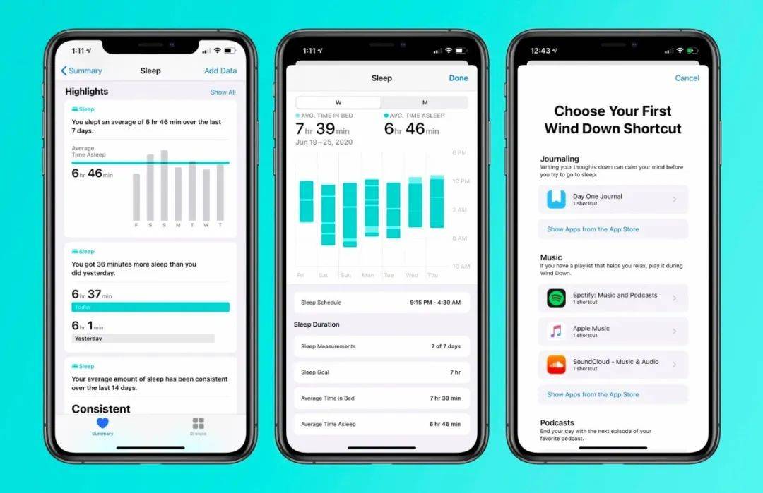数据太多会引起用户对睡眠量不足的焦虑,苹果希望避免这样的事情发生。取而代之的是,在用户实现了既定的睡眠目标时,对他们给予认可。