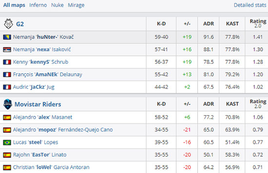 决胜图的G2与图一相似在丢到手枪局的情况下再次在防守端Carry,nexa与kennyS两位关键选手的发挥让G2在防守端再取10分,下半场成功拿下手枪局后G2几乎宣判Movistar Riders的死刑,最终G2以16-6的比分成功击败Movistar Riders。