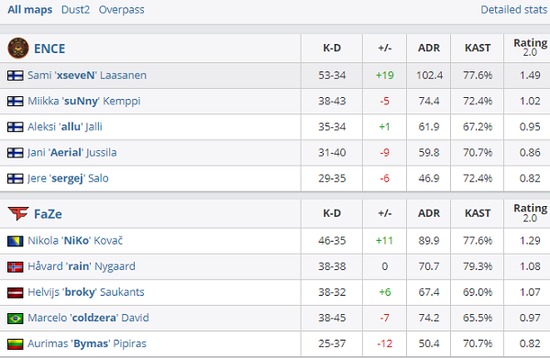 FaZe 0-2 ENCE(Dust2 13-16;Overpass 13-16)