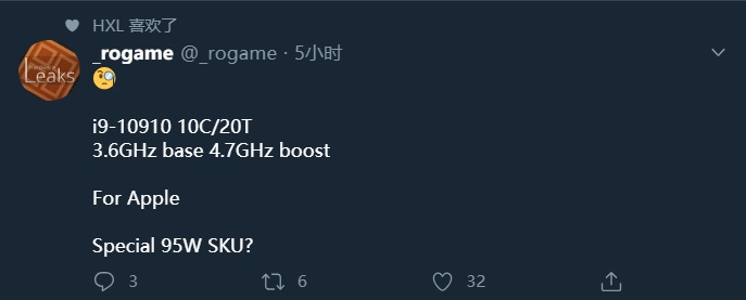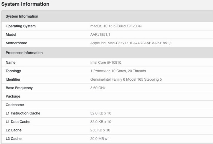 今天早些时候, 爆料者 @_rogame 发现一款苹果设备已经出现在了 Geekbench 跑分平台,搭载了英特尔十代酷睿 i9-10900,但其主频相比英特尔公版要高很多。