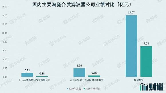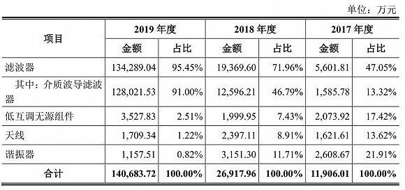 从收入情况看,2019年灿勤科技营收14亿元,其中介质波导滤波器即陶瓷介质滤波器收入为12.8亿元,占比为91%,收入规模是2018年的10倍,其他产品包括低互调无源组件、天线和谐振器。
