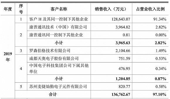 值得注意的是,灿勤科技爆发式增长离不开大客户华为的加持。2019年,公司对华为销售达到12.8亿元,占营业收入的91.34%,形成大客户依赖。