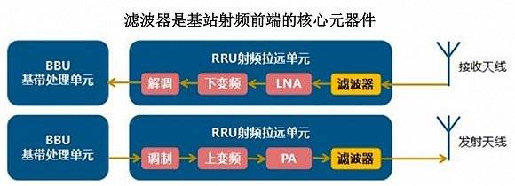 在通信基站中,滤波器是关键一环。射频通信系统在收发过程中都需要滤波器发挥滤波功能,用来消除接收和发射通道的干扰和杂波,使有用信号尽可能无衰减地通过,对无用信号尽可能地衰减,从而实现准确选频。