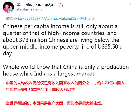 但就像我先前分析的,印度人往往因为缺乏常识,导致自我感觉过好。像下面这位,在他心目中好像中国比印度还穷(实际上,世界上最大的市场前两名是美国和中国)。