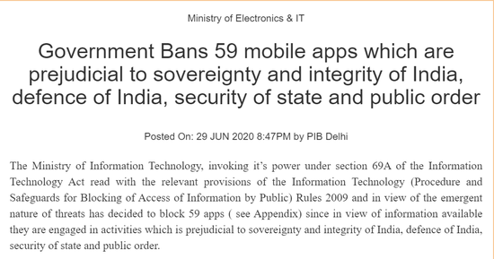 当然,他们自己说得还有些遮遮掩掩:说是出于“安全”考虑,认为这些App有损印度主权、国防、国家安全和公共秩序。