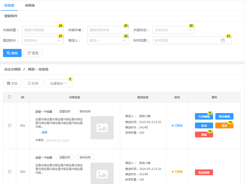 (7)频道信息流内容操作(内容编辑、推送编辑、移动和屏蔽操作)正在开发中;