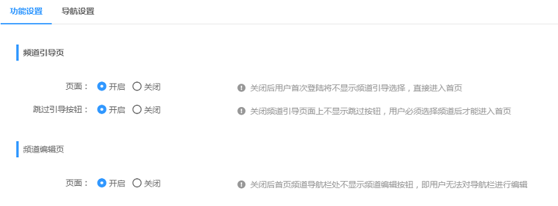(2)功能设置,频道引导页开关、频道编辑页开关开发完成;