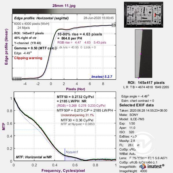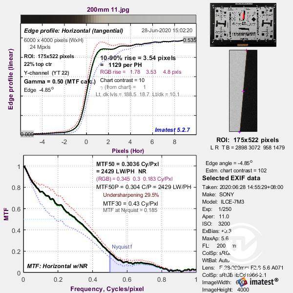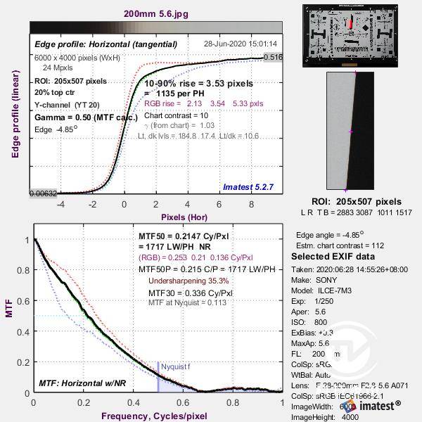 在这款镜头的测试环节中,我们使用Imatest软件对F2.8、F5.6、F11三个光圈值,以及28mm、200mm两个焦段分别搭配组成四幅图片来对它的分辨率进行测试,得到的结果如下: