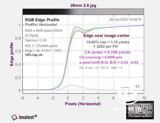 从边缘水平方向色散测试结果来看,色散区域为1.19像素,各通道的色散较分离,其中蓝色通道略低,绿色其次。