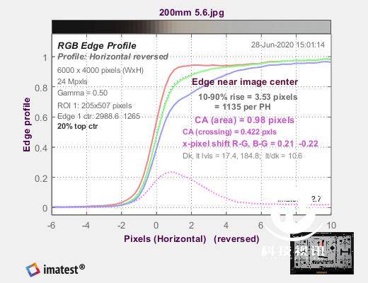 从边缘垂直方向色散测试结果来看,色散区域为0.98像素,各通道的色散较分离,其中蓝色通道略低,绿色其次。