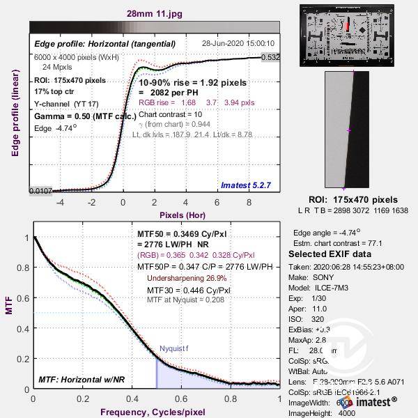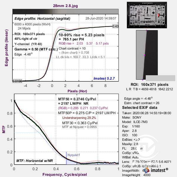 (1) 在28mm焦段、F2.8光圈下,对这款镜头的上侧位置进行分析: