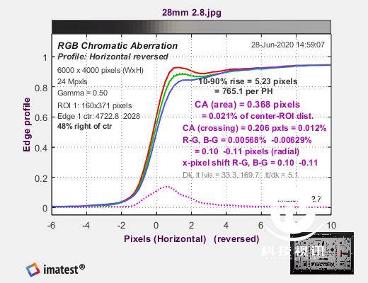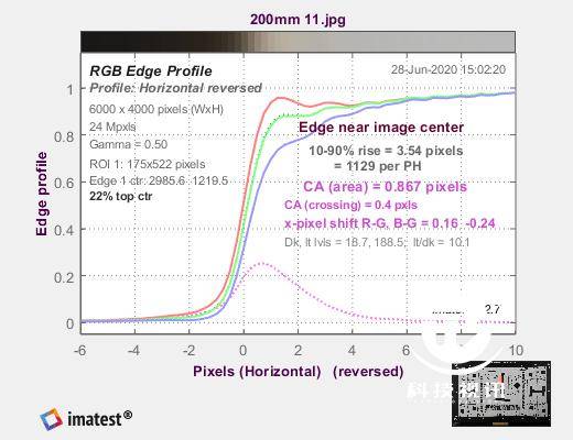 从边缘水平方向色散测试结果来看,色散区域为0.421像素,各通道的色散较为接近,其中蓝色通道略低。