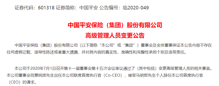 原标题:马明哲辞任中国平安CEO!姚波出任联席CEO !