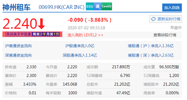 7月2日上午消息,神州租车今日开跌逾2%,截至发稿,神州租车跌3.86%报2.24港元,港股市值47.49亿港元。