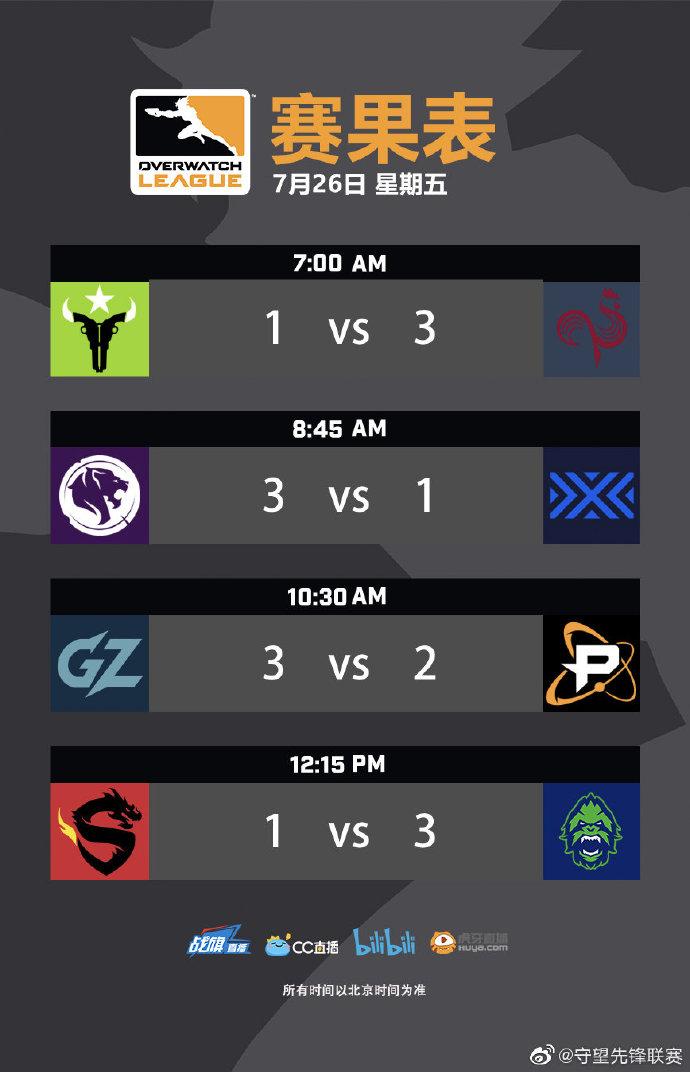 常规赛第四阶段第一周第一日赛果,休斯顿神枪手队 1:3 巴黎永生队;洛杉矶角斗士队3:1 纽约九霄天擎队 ;广州冲锋队 3:2 费城融合队 ;上海龙之队 1:3 温哥华泰坦队。