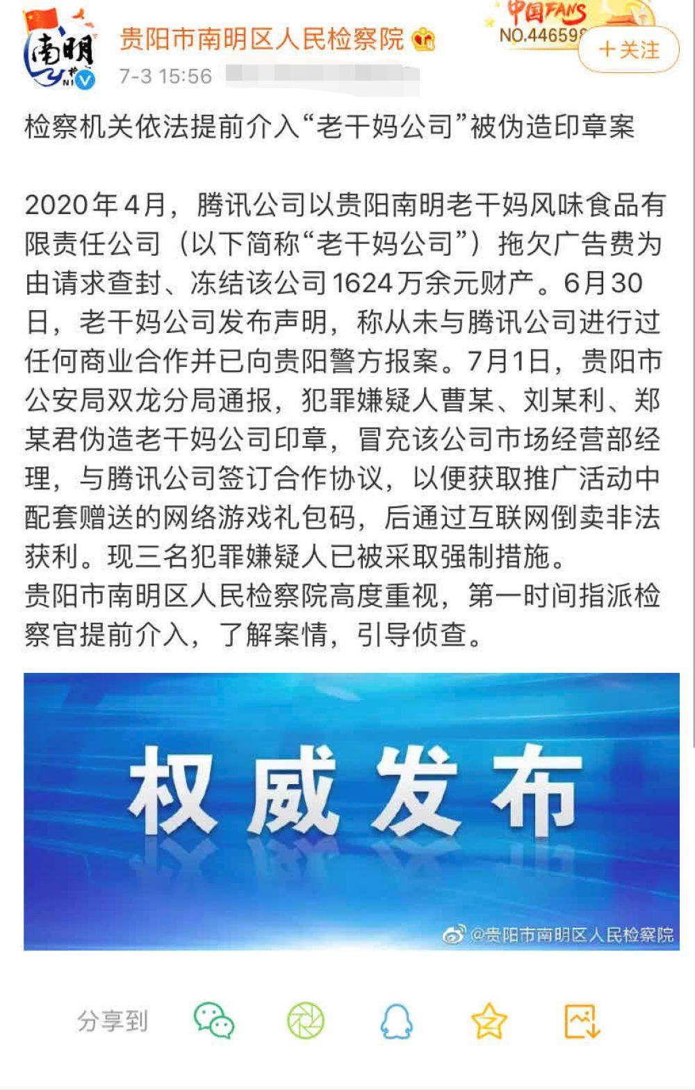 从6月30日,老干妈公司发布声明,称从未与腾讯公司进行过任何商业合作并已向贵阳警方报案开始,短短3天时间内,贵阳市公安局双龙分局已将三名犯罪嫌疑人采取强制措施,贵阳市南明区人民检察院也已经提前介入。