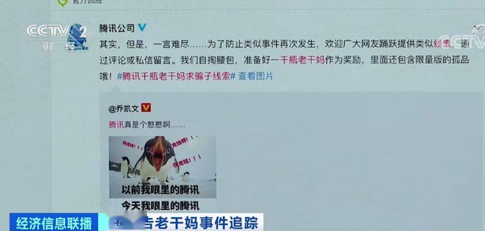在微博主页上,腾讯发出了一千瓶老干妈求线索的微博,在哔哩哔哩上,腾讯的官方UP主发的《我就是那个吃了假辣椒酱的憨憨企鹅》,已经有500多万次的观看,引发热议。