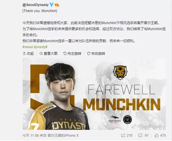 经过短暂的休息吼,Munchkin还是选择离开了首尔王朝。
