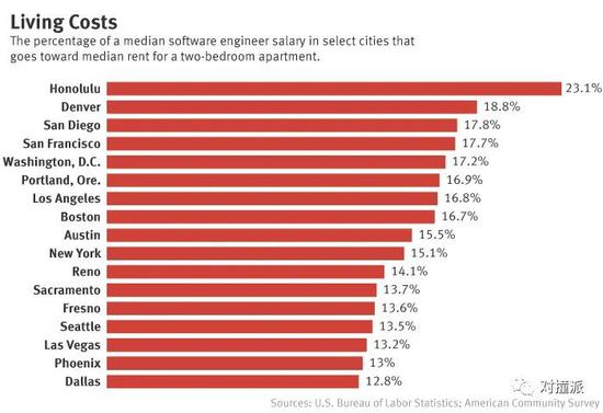 从程序员的房租收入比来看,旧金山还排不到第一,西雅图也只有13%。