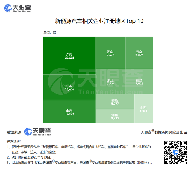 天眼查数据显示,我国目前经营范围含“新能源汽车、电动汽车、插电式混合动力汽车、燃料电池汽车”的企业(以下简称“新能源汽车相关企业”)超过14万家。从地域分布上看,我国新能源汽车相关企业数量最多的省份分别为广东省、江苏省和山东省,三省企业数之和约占全国的三分之一。湖南、河南、浙江、福建等省份和地区的企业数量紧随其后。