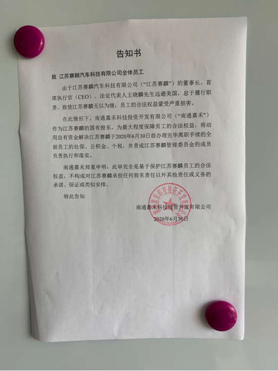 留守的工作人员注意到,工厂内贴了一张赛麟汽车国有股东南通嘉禾出具的告知书: